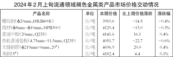 2月上旬,φ20毫米HRB400E螺紋鋼價格為3910.6元/噸,環(huán)比下降14.5元/噸,降幅為0.4%;φ8毫米~φ10毫米HPB300線材價格為4120.4元/噸,環(huán)比下降13元/噸,降幅為0.3%;20毫米Q235普通中板價格為4141.6元/噸,環(huán)比上漲16.1元/噸,漲幅為0.4%;4.75毫米~11.5毫米Q235熱軋普通卷板價格為4051.7元/噸,環(huán)比下降22.7元/噸,降幅為0.6%;φ219毫米×6毫米20#無縫鋼管價格為4696.9元/噸,環(huán)比上漲20.0元/噸,漲幅為0.4%;5#角鋼價格為4182.4元/噸,環(huán)比上漲4.4%,漲幅為0.1%。(郭同炬)