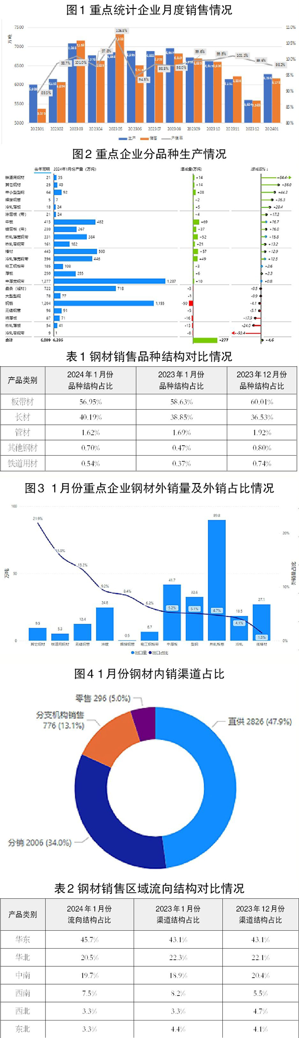1月份重點統計鋼鐵企業(以下簡稱重點企業)鋼材產量為6286萬噸,同比增長4.6%,比2023年12月份增長12.2%。新年伊始,重點企業生產逐步恢復。1月份,重點企業銷售鋼材6173萬噸,同比增長14.9%,比去年12月份增長10.6%。