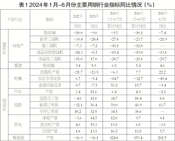 上半年,主要用鋼行業運行呈分化態勢,建筑業繼續下行,制造業平穩增長。其中,房地產主要指標同比繼續下降;基礎設施建設投資和電力投資保持穩定增長,增幅有所收窄;機械行業工業增加值保持正增長,機電產品出口額增幅有所擴大;船舶和集裝箱行業實現大幅增長;汽車產量保持平穩增長,其中新能源汽車產量和汽車出口量繼續大幅增長;家電行業三大白電產品(空調、冰箱、洗衣機)產量均保持增長,增幅有所收窄。
