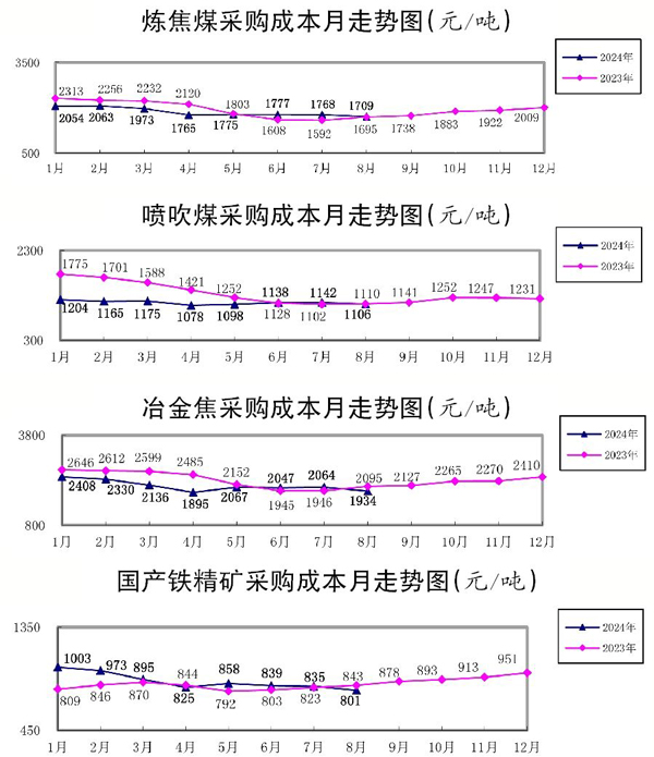 8月份,各原燃材料品種采購成本環(huán)比下降,多數(shù)品種降幅超過3%。