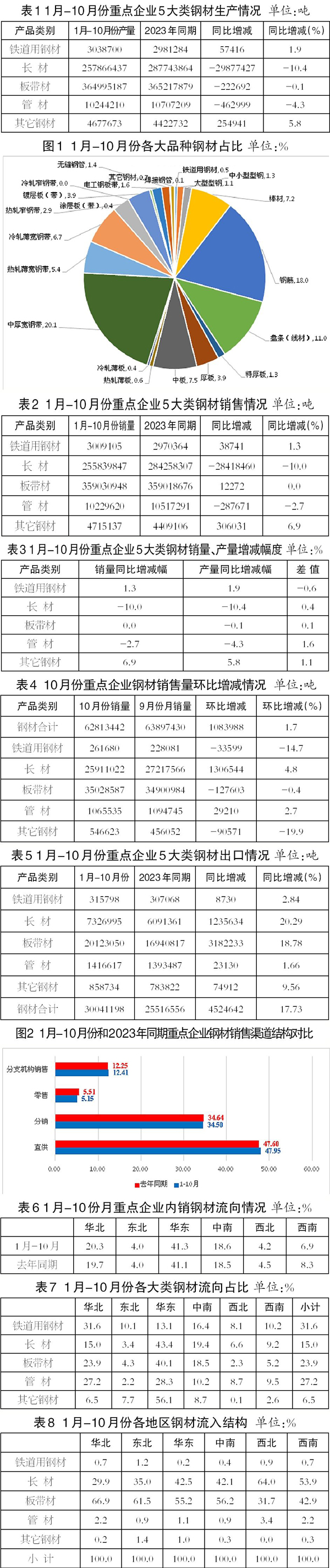 10月份,重點企業生產鋼材6474.1萬噸,同比下降2.4%、環比增長4.6%;銷售鋼材6389.7萬噸,同比下降3.5%、環比增長1.7%。
