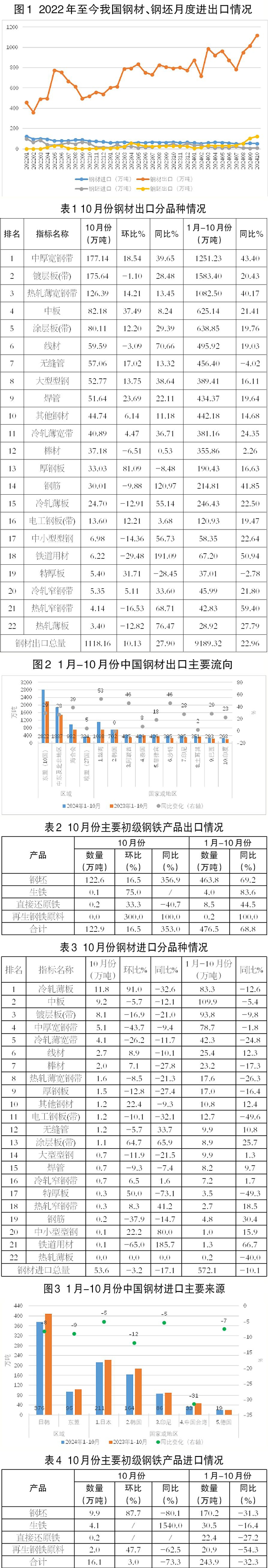 1月—10月份,我國累計出口鋼材9189.3萬噸,同比增加1716.1萬噸、增幅達23.0%;累計平均出口單價為761.4美元/噸,同比減少202.8美元/噸、降幅達21.0%;累計出口鋼坯463.8萬噸,同比增加189.7萬噸、增幅達69.2%;折合粗鋼凈出口9232萬噸,同比增加2110萬噸、增幅達29.6%。我國累計進口鋼材572.1萬噸,同比減少64.6萬噸、降幅達10.1%;累計平均進口單價為1682.2美元/噸,同比增加11.5美元/噸、增幅達0.7%;累計進口鋼坯170.2萬噸,同比減少77.5萬噸、降幅達31.3%。