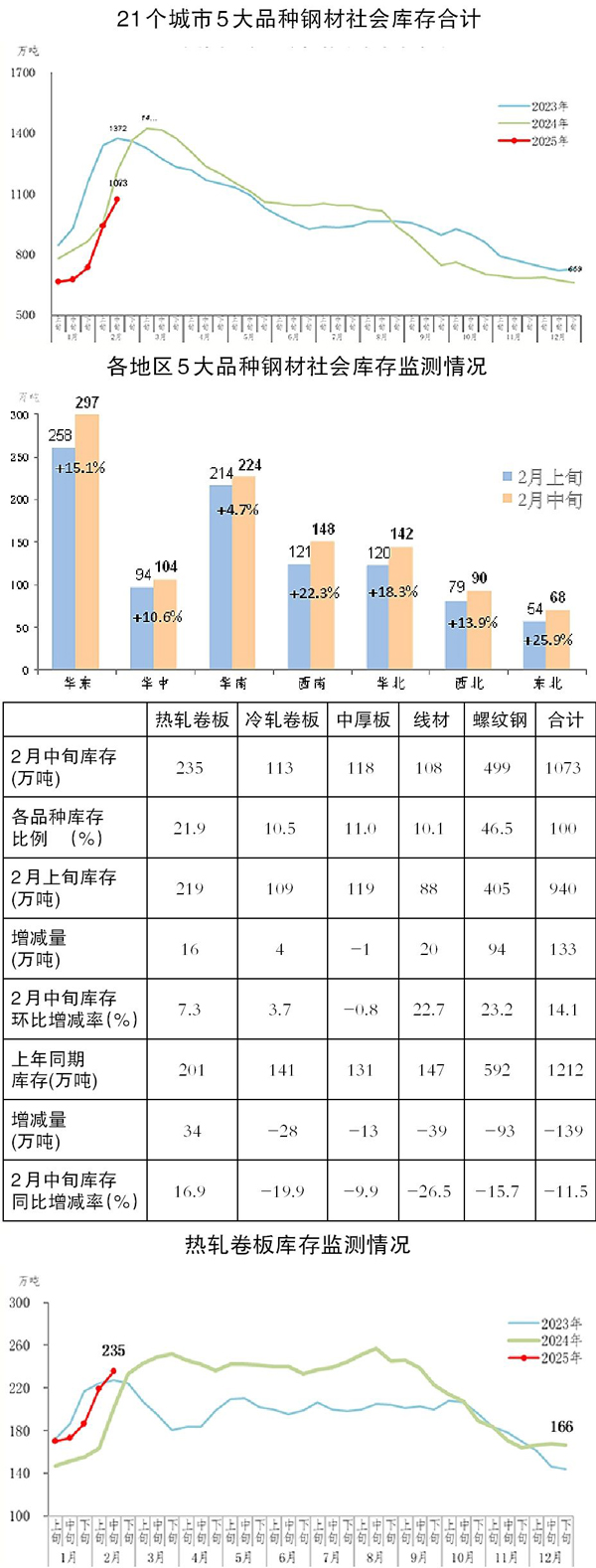 2月中旬,分地區(qū)來看,7大區(qū)域鋼材庫存環(huán)比均繼續(xù)上升,具體情況見圖。