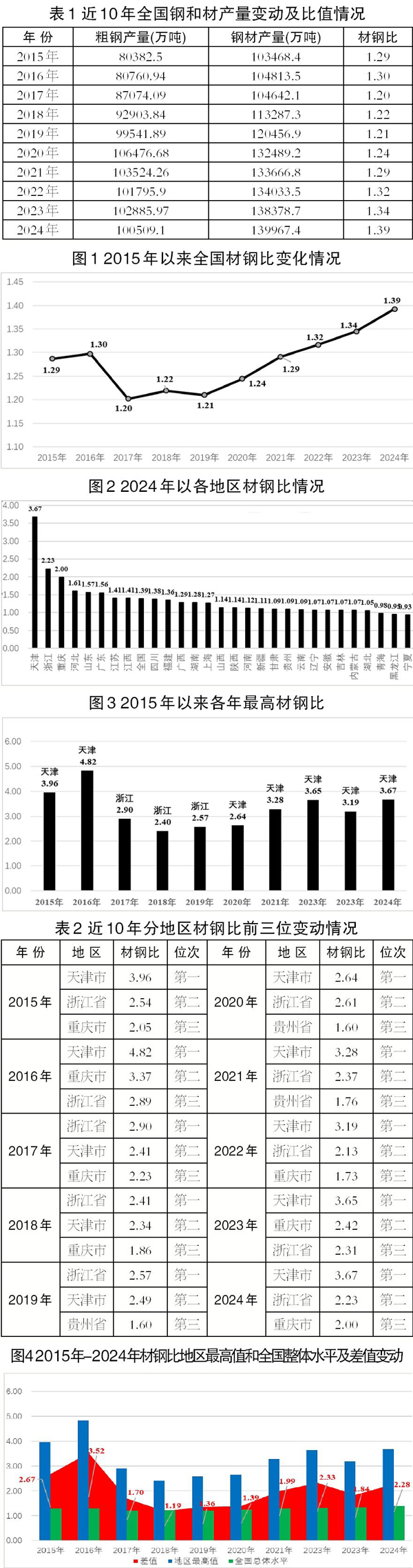 根據(jù)國(guó)家統(tǒng)計(jì)局發(fā)布的數(shù)據(jù)計(jì)算得知,近10年全國(guó)材鋼比未低于1.2。其中,2015年、2016年材鋼比分別為1.29、1.30;在國(guó)家推進(jìn)供給側(cè)結(jié)構(gòu)性改革,化解鋼鐵過(guò)剩產(chǎn)能、整治“地條鋼”后,于2017年降至1.20,并在此后的2018年、2019年保持相對(duì)穩(wěn)定,分別為1.22、1.21;自2020年后,隨著國(guó)家工業(yè)化進(jìn)程的加快,全國(guó)材鋼比持續(xù)提升,2024年提升至1.39。