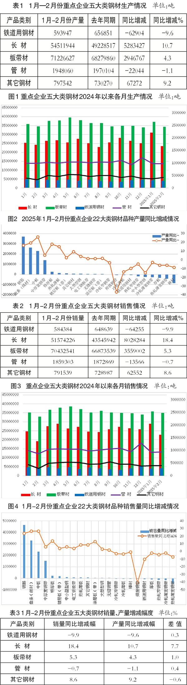1月—2月份,全國累計(jì)生產(chǎn)粗鋼16630萬噸、同比下降1.5%,平均日產(chǎn)281.86萬噸、同比增長0.2%;生產(chǎn)鋼材22409萬噸、同比增長4.7%,平均日產(chǎn)379.81萬噸、同比增長6.5%。納入營銷月報(bào)統(tǒng)計(jì)的重點(diǎn)統(tǒng)計(jì)鋼鐵企業(yè)(下稱重點(diǎn)企業(yè))生產(chǎn)鋼材1.29億噸,同比增長6.8%。重點(diǎn)企業(yè)銷售鋼材1.25億噸,同比增長10.2%,一改前期下降態(tài)勢,且增幅相較前期下降幅度逆轉(zhuǎn)了14個(gè)百分點(diǎn)。