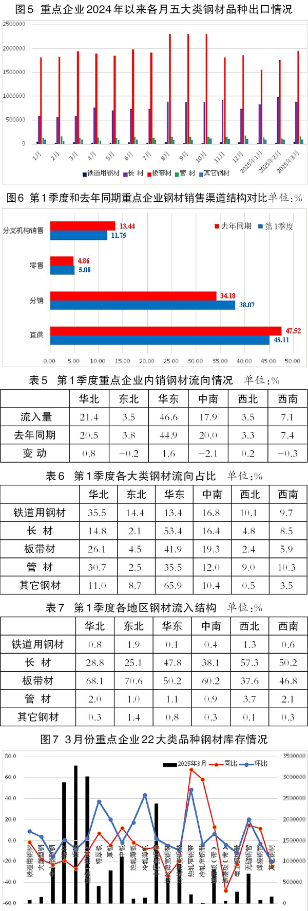 第1季度,重點企業鋼材內銷按照區域流入量統計,華東地區、華北地區、中南地區是主要流入地區,3個地區的鋼材流入合計量占重點企業內銷鋼材總量的85.9%,比去年同期提升0.3個百分點。