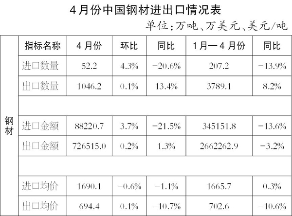 1月—4月份,由于國內階段性供需矛盾持續存在,疊加越南、韓國等國家部分重點貿易救濟調查的持續,部分企業加快接單及出口節奏,我國鋼材出口量總體仍處于高位。但從今年4月份鋼材出口均價和金額環比企穩的態勢看, “量增額降”“量增價跌”的態勢已初步得到緩解。隨著后續國家有關部委針對出口應稅貨物進行協同監管,后期鋼材出口規模應更趨規范理性。建議企業持續改善出口品種結構,積極應對國外貿易摩擦。