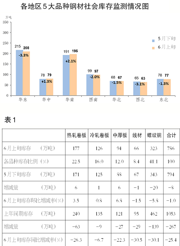 6月上旬,分地區(qū)來看,7大區(qū)域鋼材社會(huì)庫存各有升降,其中華東地區(qū)為庫存減量和降幅最大地區(qū)。具體情況見右圖。