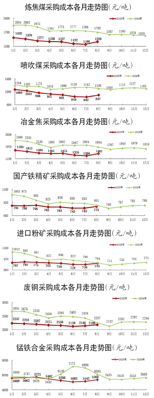 1月—8月份,“對(duì)標(biāo)挖潛”企業(yè)各品種采購(gòu)成本同比降幅較大,但降幅較前7個(gè)月收窄。