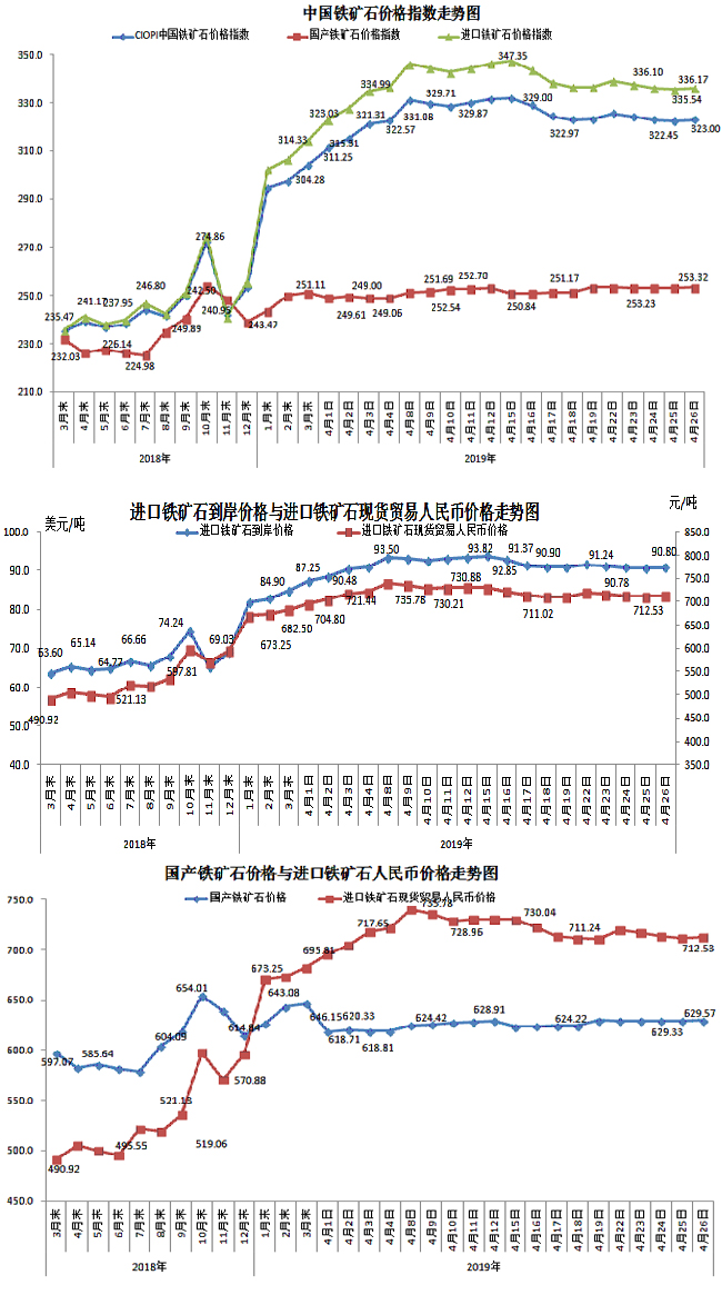 4月26日,中國鐵礦石價格指數(shù)(CIOPI)323.00點,環(huán)比上升0.54點,升幅為0.17%。其中:國產鐵礦石價格指數(shù)為253.32點,環(huán)比上升0.09點,升幅為0.04%;進口鐵礦石價格指數(shù)為336.17點,環(huán)比上升0.63點,升幅為0.19%。