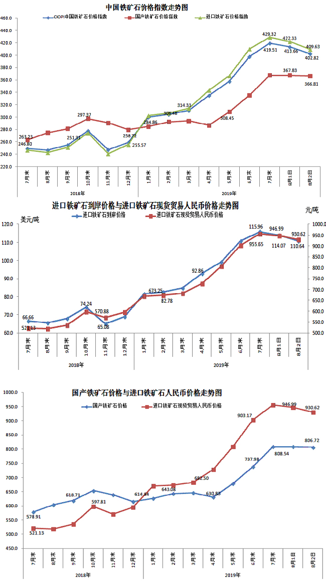 8月2日,中國鐵礦石價格指數(shù)(CIOPI)402.82點,環(huán)比下降10.84點,降幅為2.62%。其中:國產(chǎn)鐵礦石價格指數(shù)為366.81點,環(huán)比下降1.02點,降幅為0.28%;進(jìn)口鐵礦石價格指數(shù)為409.63點,環(huán)比下降12.70點,降幅為3.01%。