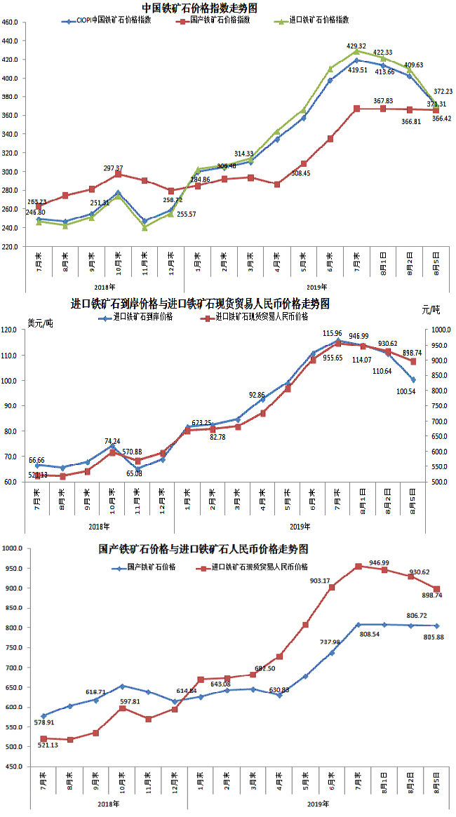 8月5日,中國鐵礦石價格指數(CIOPI)371.31點,環比下降31.51點,降幅為7.82%。其中:國產鐵礦石價格指數為366.42點,環比下降0.38點,降幅為0.10%;進口鐵礦石價格指數為372.23點,環比下降37.39點,降幅為9.13%。