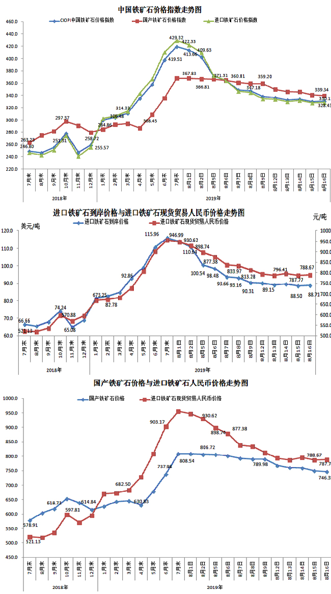 8月16日,中國鐵礦石價格指數(shù)(CIOPI)330.17點,環(huán)比上升0.45點,升幅為0.14%。其中:國產(chǎn)鐵礦石價格指數(shù)為339.34點,環(huán)比下降1.27點,降幅為0.37%;進(jìn)口鐵礦石價格指數(shù)為328.43點,環(huán)比上升0.78點,升幅為0.24%。