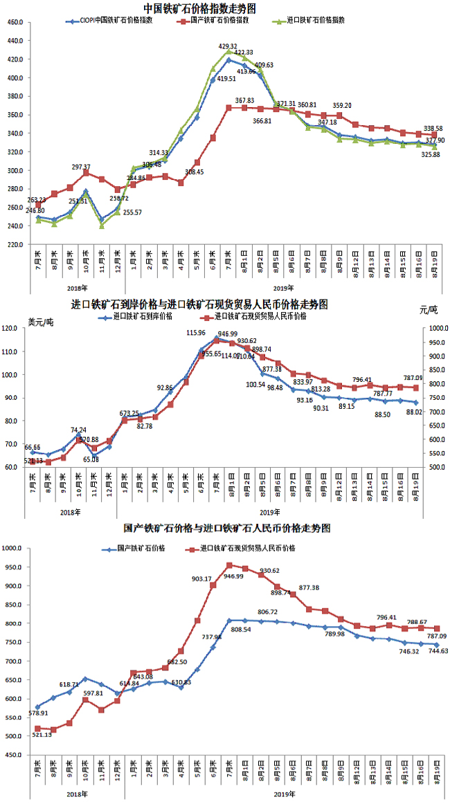 8月19日,中國鐵礦石價格指數(shù)(CIOPI)327.90點,環(huán)比下降2.27點,降幅為0.69%。其中:國產(chǎn)鐵礦石價格指數(shù)為338.58點,環(huán)比下降0.77點,降幅為0.23%;進口鐵礦石價格指數(shù)為325.88點,環(huán)比下降2.55點,降幅為0.78%。