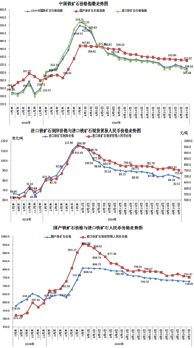 8月27日,中國鐵礦石價格指數(CIOPI)309.54點,環比下降5.84點,降幅為1.85%。其中:國產鐵礦石價格指數為331.02點,環比下降0.88點,降幅為0.27%;進口鐵礦石價格指數為305.48點,環比下降6.78點,降幅為2.17%。