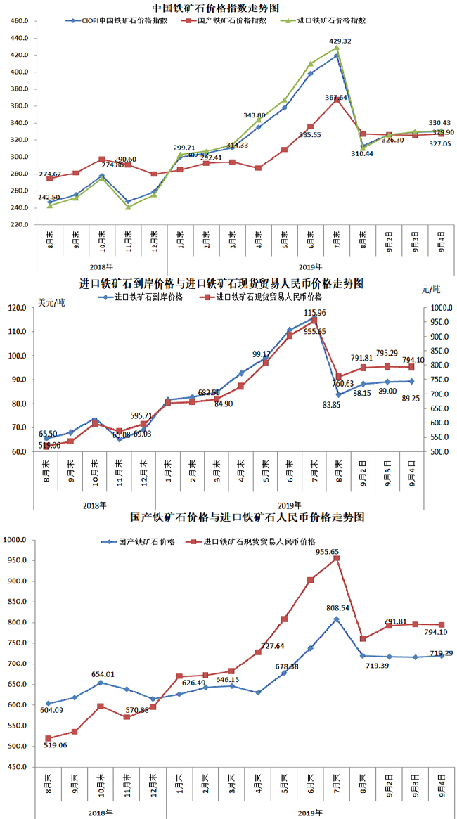 9月4日,中國鐵礦石價格指數(CIOPI)329.90點,環比上升1.00點,升幅為0.31%。其中:國產鐵礦石價格指數為327.05點,環比上升1.42點,升幅為0.44%;進口鐵礦石價格指數為330.43點,環比上升0.93點,升幅為0.28%。