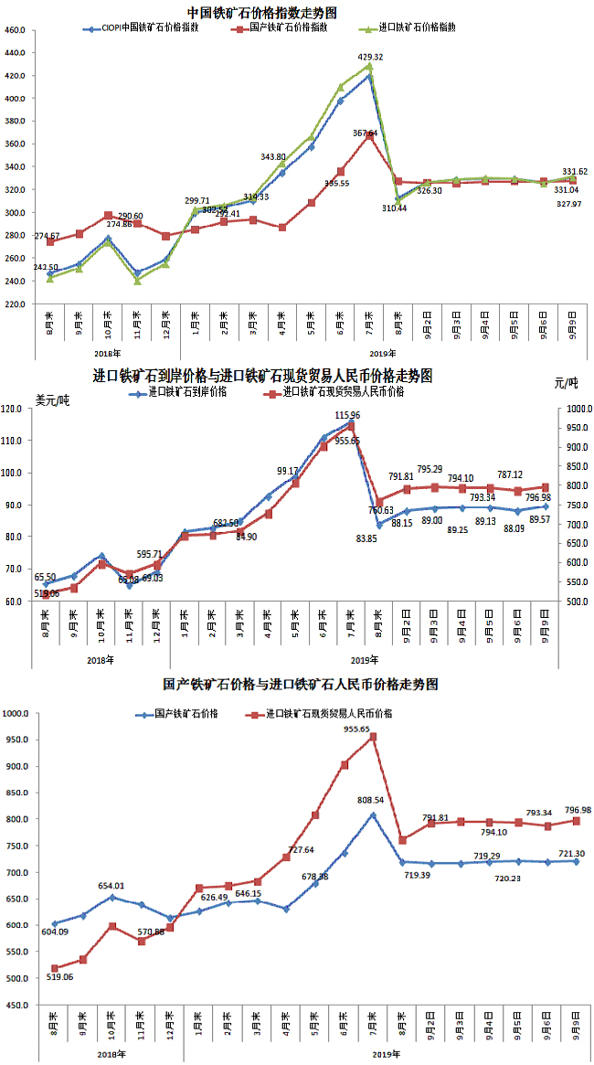 9月9日,現(xiàn)貨貿(mào)易進(jìn)口鐵礦石62%品位干基粉礦人民幣含稅價格為796.98元/噸,環(huán)比每噸上升9.86元,升幅為1.25%,當(dāng)月平均價格為793.11元/噸。