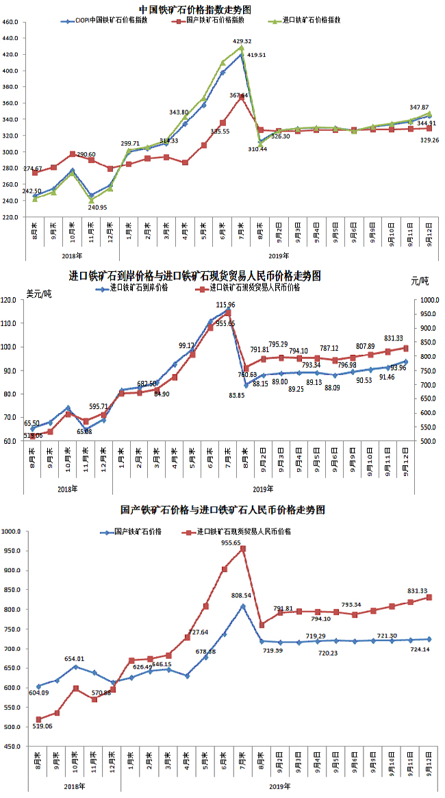 9月12日,中國鐵礦石價格指數(CIOPI)344.91點,環比上升7.91點,升幅為2.35%。其中:國產鐵礦石價格指數為329.26點,環比上升0.79點,升幅為0.24%;進口鐵礦石價格指數為347.87點,環比上升9.26點,升幅為2.73%。