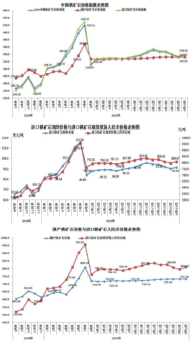 9月23日,中國鐵礦石價格指數(CIOPI)337.57點,環比上升3.55點,升幅為1.06%。其中:國產鐵礦石價格指數為332.65點,環比上升0.03點,升幅為0.01%;進口鐵礦石價格指數為338.50點,環比上升4.22點,升幅為1.26%。