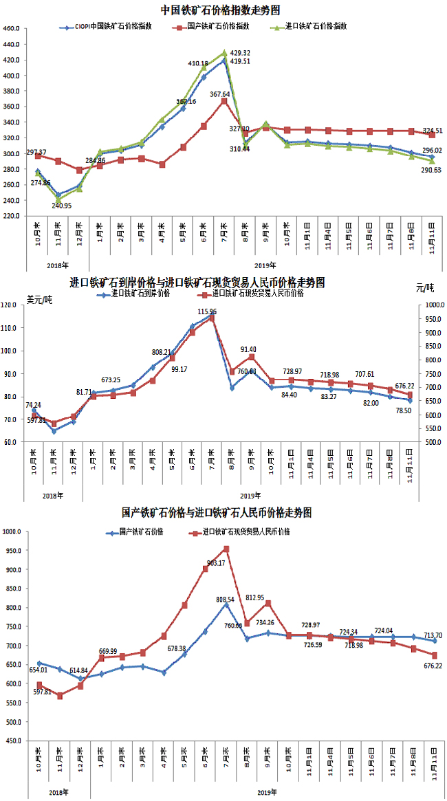11月11日,中國鐵礦石價格指數(CIOPI)296.02點,環比下降5.64點,降幅為1.87%。其中:國產鐵礦石價格指數為324.51點,環比下降4.50點,降幅為1.37%;進口鐵礦石價格指數為290.63點,環比下降5.85點,降幅為1.97%。