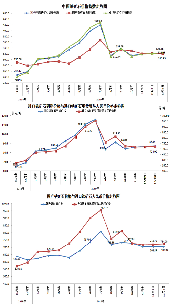 12月3日,現(xiàn)貨貿(mào)易進口鐵礦石62%品位干基粉礦人民幣含稅價格為724.00元/噸,環(huán)比每噸上升5.24元,升幅為0.73%,當月平均價格為721.38元/噸。