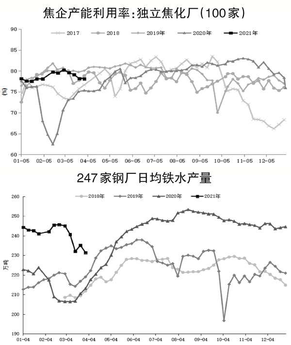 上周(3月29日~4月2日),焦炭期貨主力J2105合約價格延續3月24日以來的反彈走勢,焦價回升到2400元/噸附近,較低點反彈近300元/噸,焦價在整個第一季度持續下跌的趨勢有望被打破。現貨市場偏弱運行,第8輪調降逐步落地。至此,焦價自2月19日開啟調降周期以來,已連續下調8輪,累計跌幅800元/噸。上周五(4月2日),受期貨價格走強的帶動,現貨市場情緒回暖,山西省、河北省、山東省等主流市場焦企聯合開啟第1輪提漲,其中對干熄焦價格上調110元/噸,對濕熄焦價格上調100元/噸,于4月6日起執行。
