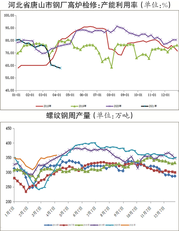 河北省唐山市限產政策自3月20日0時起執行,近期有傳聞稱高爐復產,限產放松,供應寬松給市場帶來壓力。相關機構調研數據顯示,4月1日~4月15日,河北省唐山市地區復產高爐8座,容積10422立方米,日均鐵水產量為3.1萬噸;4月7日~4月15日,該地區126座高爐中66座檢修,周影響產量114.1萬噸,產能利用率為58.93%,周環比上升1.1%,較上月同期下降1.34%,較去年同期下降22.73%。由此可見,河北省唐山市仍在嚴格執行限產減排比例,無松動跡象。