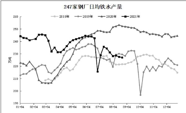 需求方面,自7月份各地鋼廠陸續執行粗鋼產量同比不增或減少的政策以來,產量數據上已有明顯下降,減產政策初見成效,但粗鋼累計同比增幅仍較大,國家相關部門下一步將繼續關注并敦促減產政策執行不力的省份,按時按量完成任務。粗鋼作為生鐵的下游產品,壓減粗鋼產量必然會對生鐵產量形成抑制,進而影響焦炭需求。因此,焦炭需求仍有一定的下降壓力。高頻數據顯示,上周,247家鋼廠日均鐵水產量為227.05萬噸,較去年同期下降25.29萬噸,同時較上半年日均鐵水均值低13萬噸左右。