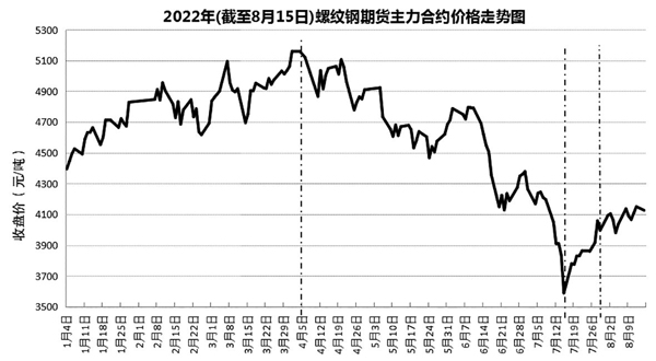 從4月初的“高峰”價(jià)位到7月中旬的“谷底”價(jià)位,螺紋鋼期貨價(jià)格下降了近1600元/噸,百日之內(nèi)的下降幅度高達(dá)30%。7月中旬之后,螺紋鋼期貨價(jià)格觸底反彈,半月之內(nèi)回升了將近500元/噸,漲幅達(dá)到了13%以上。即使到了8月中旬,螺紋鋼期貨價(jià)格的回升似乎仍意猶未盡。監(jiān)測(cè)數(shù)據(jù)顯示,8月12日,螺紋鋼期貨主力合約(RB2210)的收盤價(jià)、最高價(jià)和最低價(jià)分別為4150元/噸、4153元/噸和4100元/噸,收盤價(jià)較上一個(gè)交易日結(jié)算價(jià)上升70元/噸,上漲1.72%。