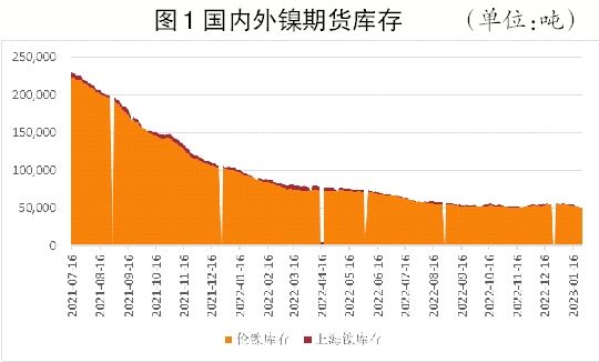 其次,“緊現實”繼續存在,國內外鎳低庫存情況仍有待改善。有色金屬普遍處于低庫存狀態,鎳庫存更是呈現比較明顯的結構性問題,至2023年1月末,LME(倫敦金屬交易所)鎳板庫存極低,已經不足1萬噸,加上鎳豆總量在5萬噸附近,一年以來庫存下滑近一半(見圖1)。國內鎳庫存保持低位,1月中旬,進出口窗口打開,保稅區鎳資源有所流入,但春節前需求較淡,直接流入有限。不過,多家進口貿易商開始準備鎖價進口,但新進口資源到貨預計需要一個半月的時間,短期內對鎳現貨市場供應的影響較小。現階段仍需關注進口窗口的開啟情況及進口鎳的流入量。當前國內鎳期現貨加上保稅區的庫存總量不足1.5萬噸,同比下滑近25%。春節后鎳合金補庫需求仍存,且不銹鋼需求好轉預期階段有所回升,對鎳需求有所拉動。硫酸鎳在節前呈現企穩回升的走勢,硫酸鎳生產電積鎳的消息引發頭部三元鋰電池廠商對未來原料供應的擔憂,補貨意愿增強,詢價頻繁,使得鎳價走勢趨堅,震蕩略偏強。
