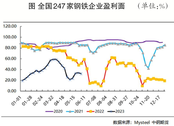 在此之后,停產(chǎn)檢修情況蔓延至全國(guó)多地的鋼廠。但此情況維持時(shí)間不久,隨著利潤(rùn)的小幅改善,此前停產(chǎn)減產(chǎn)的鋼廠便陸續(xù)復(fù)產(chǎn)。截至6月2日當(dāng)周(5月27日—6月2日),全國(guó)247家鋼廠盈利面為32.9%,比一個(gè)月前的5月5日當(dāng)周(5月1日—5日)擴(kuò)大近11個(gè)百分點(diǎn)。截至6月1日當(dāng)周(5月25日—31日),螺紋鋼產(chǎn)量為273.41萬(wàn)噸,環(huán)比上升3.03萬(wàn)噸,同比下降24.21萬(wàn)噸;熱軋卷板產(chǎn)量為310.06萬(wàn)噸,環(huán)比下降5.25萬(wàn)噸,同比下降4.98萬(wàn)噸。螺紋鋼周產(chǎn)量低于過(guò)去5年的同期水平,但已連續(xù)2周回升,有繼續(xù)上升趨勢(shì)。