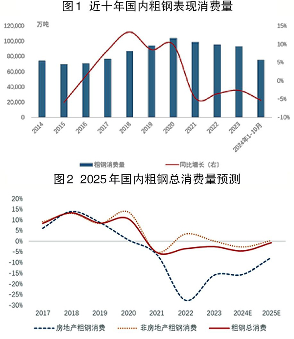統計數據顯示,2024年1月—10月份我國房屋新開工面積為61227萬平方米,累計同比減少22.6%;房屋施工面積為720660萬平方米,累計同比減少12.4%。據此推算,2024年我國房地產粗鋼消費同比減少15.5%。展望2025年,中性情景下房屋新開工面積和施工面積邊際改善,同比降幅分別收窄至10%和6%,那么房地產粗鋼消費同比下降7.7%。