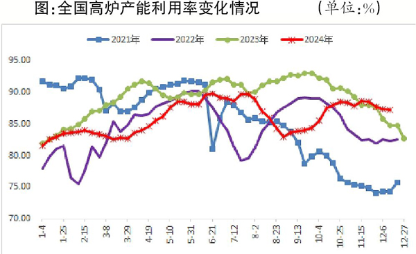 從高頻數據來看,受利潤狀況影響,全國高爐產能利用率自11月中旬以來持續下行,這直接反映了鐵礦石需求的明顯萎縮。相關數據顯示,盈利鋼企占比自10月份的74%左右下降至48%左右,而全國高爐產能利用率自11月中旬的88.58%下降至87.28%。調研信息顯示,隨著鋼企盈利狀況的持續惡化,高爐檢修范圍或繼續擴大,鐵水產量或進一步下降,鐵礦石短期需求也將繼續收縮。