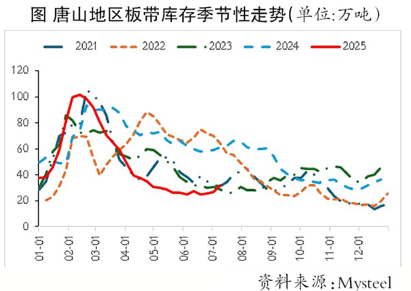 本輪鋼材價(jià)格的反彈具有很強(qiáng)的預(yù)期推動(dòng)特點(diǎn),在鋼材需求處于淡季的情況下,這一特性使得盤面更容易給出升水。截至上周末,熱軋卷板主力合約價(jià)格與現(xiàn)貨價(jià)格基本平水,相較河北唐山地區(qū)帶鋼價(jià)格則升水102元/噸。這為貿(mào)易商提供了無風(fēng)險(xiǎn)套利的機(jī)會(huì),在期現(xiàn)正套建倉的過程中,部分現(xiàn)貨流動(dòng)性被鎖定;同時(shí)還有下游空單的回補(bǔ)及之前期現(xiàn)反套的平倉,進(jìn)一步強(qiáng)化了這一正反饋邏輯。近期唐山地區(qū)卷帶現(xiàn)貨庫存連續(xù)3周回升,累計(jì)回升7.08萬噸,也表明了近期期現(xiàn)正套盤在逐步建倉。