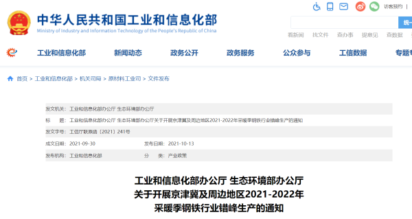 關(guān)于開展京津冀及周邊地區(qū)2021-2022年采暖季鋼鐵行業(yè)錯峰生產(chǎn)的通知