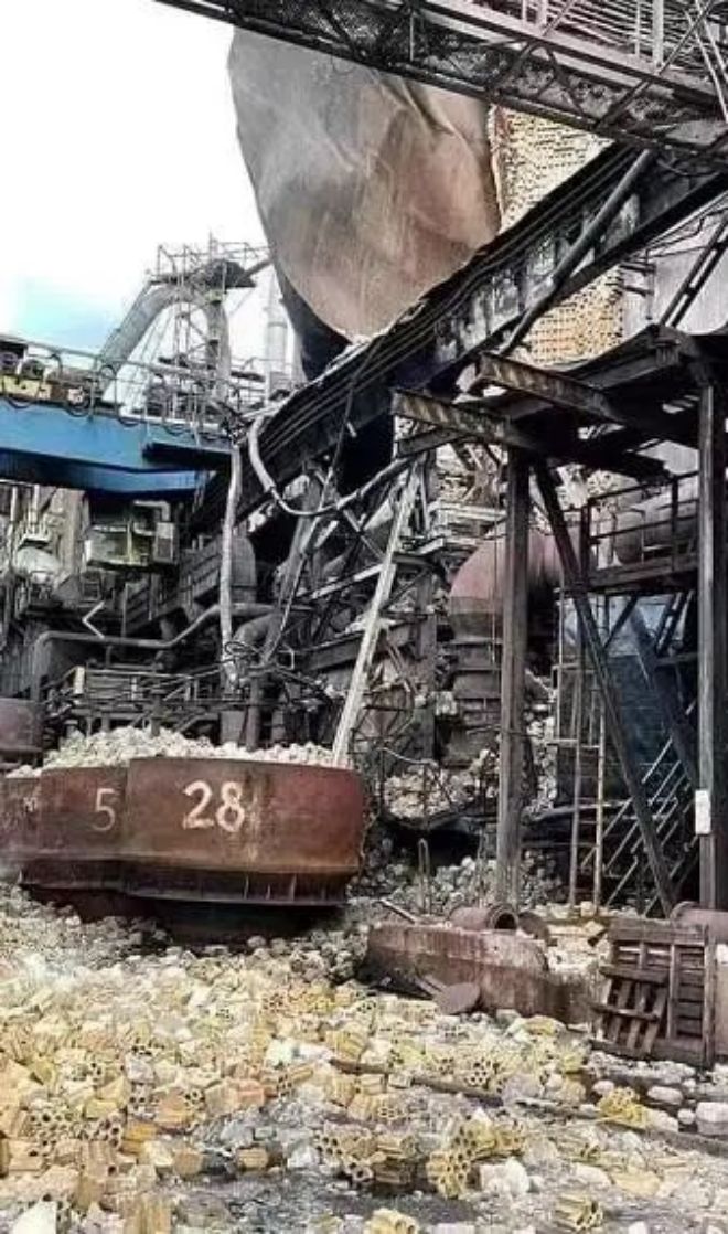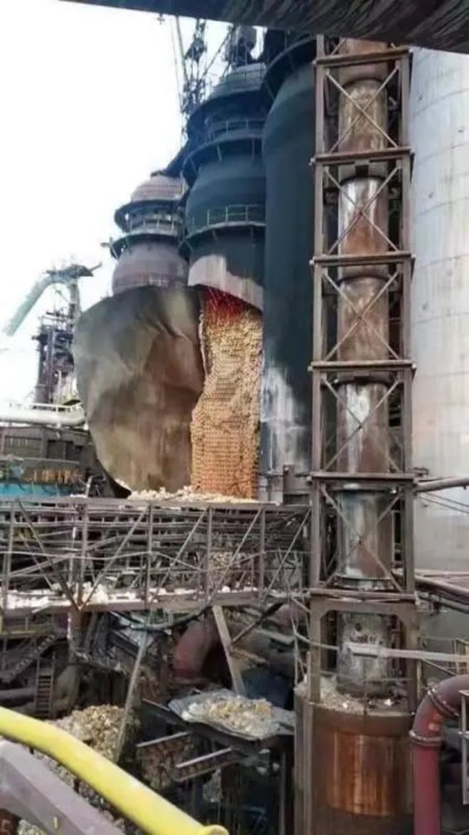 圖2 捷克一鋼廠2000m3高爐頂燃式熱風爐于2021年12月初發生的驚天爐體大爆炸安全事故,爐殼炸開一個面積約100m2~150m2的大洞,熱風爐蓄熱室數百噸1000多℃高溫大墻磚和格子磚被炸出體外。