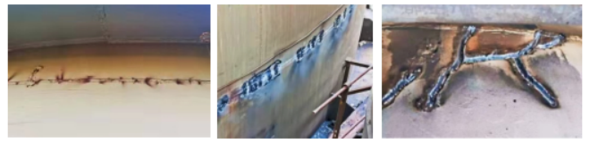 這一結論是豫興人科學計算的結果:依據壓力和燃燒室爐殼直徑計算送風盲板力,以頂燃式熱風爐燃燒室爐殼直徑13.5m,送風壓力4.5kg/cm2 、5.5kg/cm2、5.8kg/cm2進行計算,由熱風爐的4.5kg/cm2普通壓力計算產生的6441噸盲板力,提高到7873噸、8302噸,盲板力分別比傳統頂燃式熱風爐增大了1432噸和1861噸。而盲板力如此之大,選用Q345C爐殼的厚度必將增厚,由原來常規殼厚40mm增加至48mm~56mm。爐殼加厚導致加工安裝拘束應力加大、Q345C鋼板的熱脆、氣孔、焊接瑕疵加劇。當實現1280℃~1310℃超高風溫時拱頂溫度高達1400℃~1420℃(燃燒時拱頂溫度大于1420℃時NOx大于300mg/m3,送風時NOx瞬間接近2000mg/m3),超高溫產生的NOx中的NO2和低溫爐殼與爐內高溫溫差形成的冷凝水珠反應生成HNO3腐蝕 Q345C母材龜裂縫隙和焊縫縫隙,在數千噸盲板力、Q345C材質焊接瑕疵、其他腐蝕介質等綜合因素作用下,加劇爐殼開裂縫隙腐蝕,這是嚴重的安全隱患(圖2的開裂漏風點狀焊縫,如熱風爐臨近大海旁邊,空氣中的鈉離子和內部爐殼硝酸對內外殼體裂紋長期慢慢滲透腐蝕,終會使點狀漏風點串為焊縫通裂裂縫,大幅度降低爐殼焊縫強度),對工作在一線生產工人人身安全產生嚴重威脅。上述理論與實踐研發成果,不僅應該引起煉鐵工作者的高度重視,而且隨著高壓超高風溫的實現,熱風爐爐殼材質的標準應從普通機械鋼Q345C提高至壓力容 器 鋼Q345R或者耐酸腐蝕 壓力容器鋼Q345R(HIC),提上議事日程。