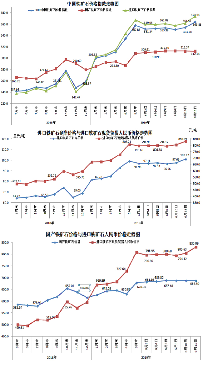 6月11日,中國鐵礦石價格指數(CIOPI)363.86點,環比上升10.12點,升幅為2.86%。其中:國產鐵礦石價格指數為312.14點,環比下降0.20點,降幅為0.06%;進口鐵礦石價格指數為373.64點,環比上升12.07點,升幅為3.34%。