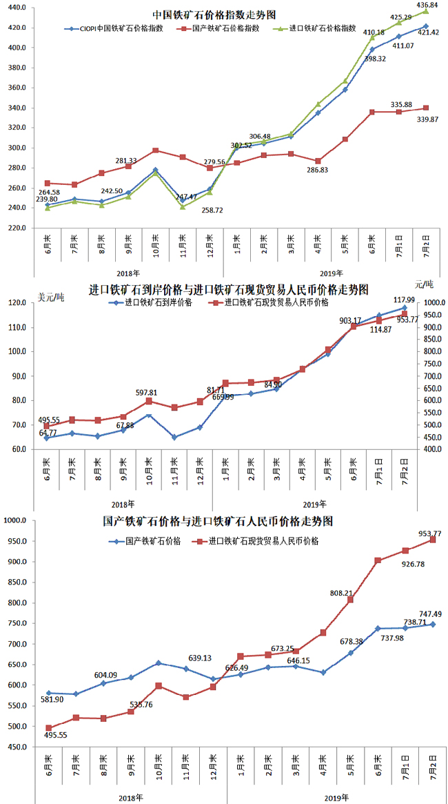 7月2日,中國鐵礦石價格指數(CIOPI)421.42點,環比上升10.35點,升幅為2.52%。其中:國產鐵礦石價格指數為339.87點,環比上升3.99點,升幅為1.19%;進口鐵礦石價格指數為436.84點,環比上升11.55點,升幅為2.72%。