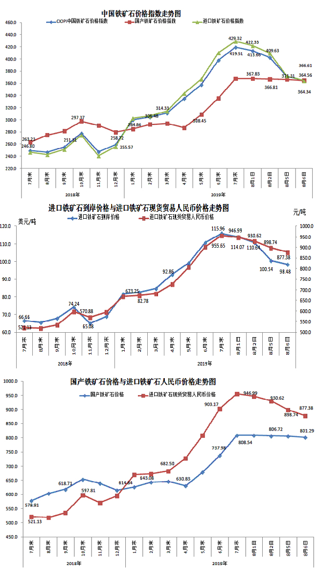 8月6日,中國鐵礦石價格指數(shù)(CIOPI)364.56點,環(huán)比下降6.75點,降幅為1.82%。其中:國產(chǎn)鐵礦石價格指數(shù)為364.34點,環(huán)比下降2.08點,降幅為0.57%;進(jìn)口鐵礦石價格指數(shù)為364.61點,環(huán)比下降7.63點,降幅為2.05%。