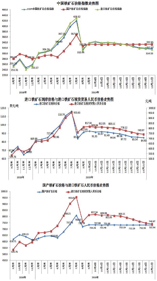 10月21日,現(xiàn)貨貿(mào)易進(jìn)口鐵礦石62%品位干基粉礦人民幣含稅價(jià)格為740.97元/噸,環(huán)比每噸下降6.15元,降幅為0.82%,當(dāng)月平均價(jià)格為786.60元/噸。