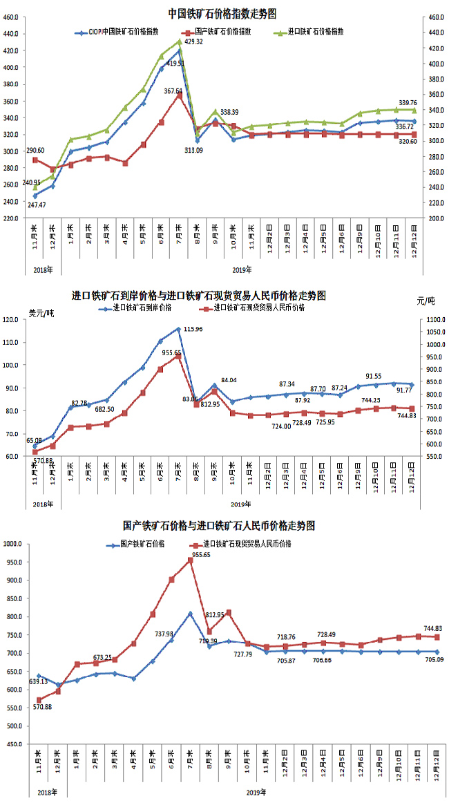 12月12日,中國鐵礦石價格指數(CIOPI)336.72點,環比下降0.59點,降幅為0.17%。其中:國產鐵礦石價格指數為320.60點,環比上升0.43點,升幅為0.13%;進口鐵礦石價格指數為339.76點,環比下降0.78點,降幅為0.23%。