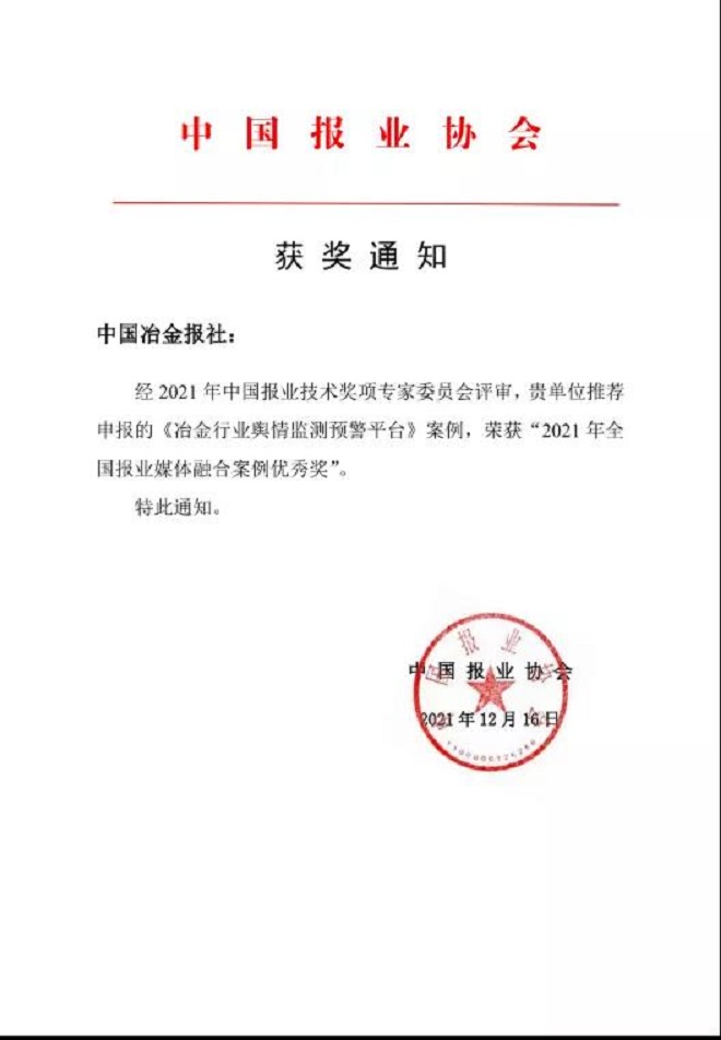 經2021年中國報業技術獎項專家委員會評審,《冶金行業輿情監測預警平臺》案例榮獲“2021年全國報業媒體融合案例優秀獎”。