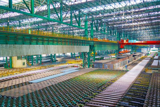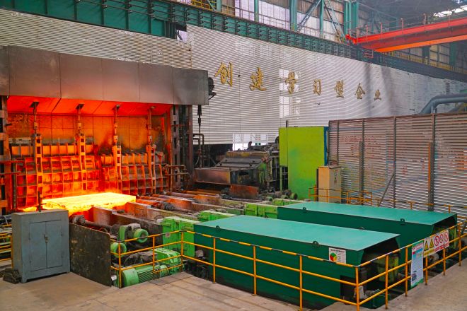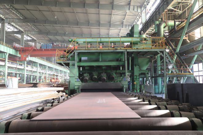 伴隨著機(jī)器轟鳴聲,軋后紅得發(fā)亮的鋼板被送進(jìn)先進(jìn)的超快冷設(shè)備,經(jīng)預(yù)矯機(jī)矯直和預(yù)設(shè)定好的工藝?yán)鋮s后,一團(tuán)巨大的水蒸氣體噴薄而出,只見一張表面光潔、形態(tài)規(guī)整的鋼板在產(chǎn)線上徐徐推進(jìn)……日前,《中國冶金報》記者來到河北普陽鋼鐵集團(tuán),在普陽鋼鐵中厚板產(chǎn)線上看到了這樣一幅壯觀的場面。