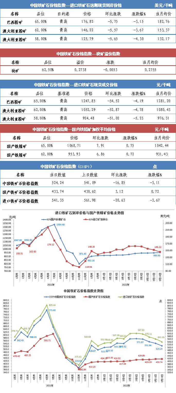 【行業指數】3月14日中國鐵礦石價格指數