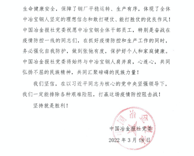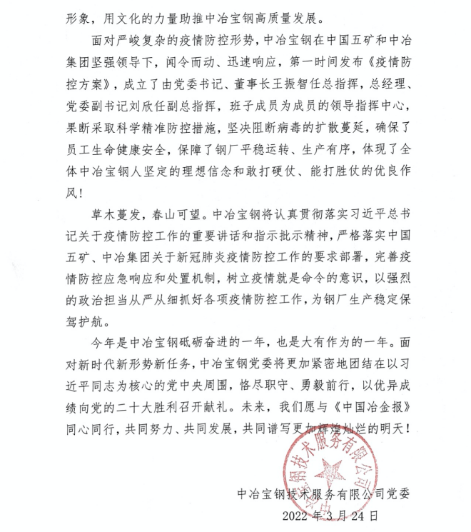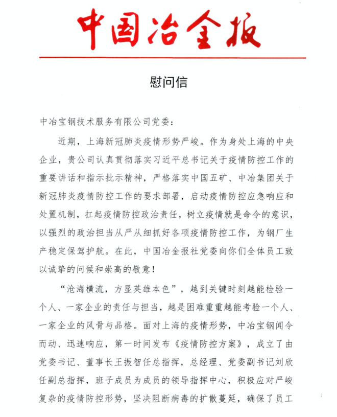 中國冶金報社致中國寶鋼技術(shù)服務(wù)有限公司黨委的慰問信 ·