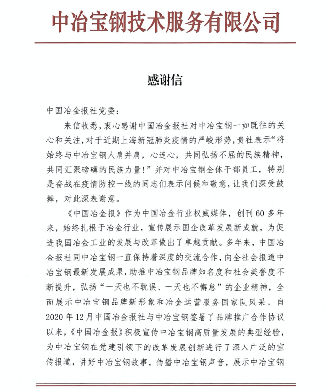 中國寶鋼技術(shù)服務(wù)有限公司黨委致中國冶金報社的感謝信 ·