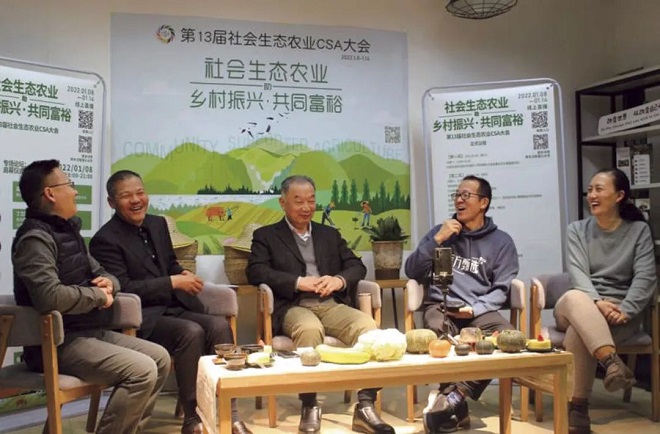 圖為丁立國(左二)參加社會生態農業大會,會間交流。