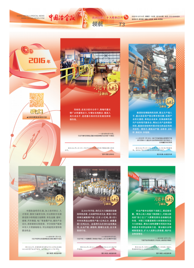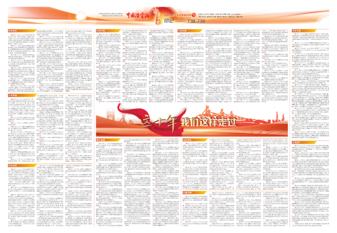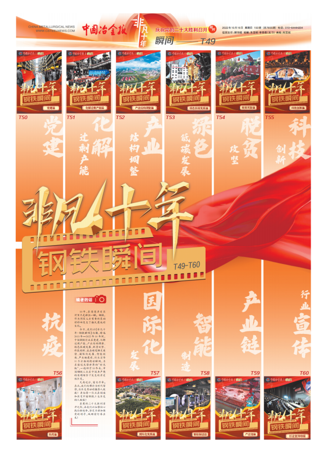 特刊以100塊版的重磅規(guī)模,以領(lǐng)航、寄語(yǔ)、心聲、答卷、印記、瞬間、收獲、篤行為主題,詳實(shí)記錄了這十年來(lái)習(xí)近平總書記與中國(guó)鋼鐵的故事,重現(xiàn)了鋼鐵行業(yè)的高光時(shí)刻與精彩瞬間,總結(jié)了中國(guó)鋼鐵業(yè)在黨的建設(shè)、供給側(cè)結(jié)構(gòu)性改革、聯(lián)合重組、綠色發(fā)展、科技創(chuàng)新、智能制造、高水平開(kāi)放、產(chǎn)業(yè)鏈現(xiàn)代化、脫貧攻堅(jiān)、抗擊疫情等10個(gè)方面取得的輝煌成就,圖文并茂展示了多家鋼鐵企業(yè)的奮斗歷程與優(yōu)秀成績(jī),還刊登了來(lái)自鋼鐵行業(yè)的黨的二十大代表和鋼鐵行業(yè)先鋒模范的寄語(yǔ)與心聲,全方位、多角度的報(bào)道增加了特刊的深度與厚度,是鋼鐵行業(yè)這十年發(fā)展成就的重要集錦。