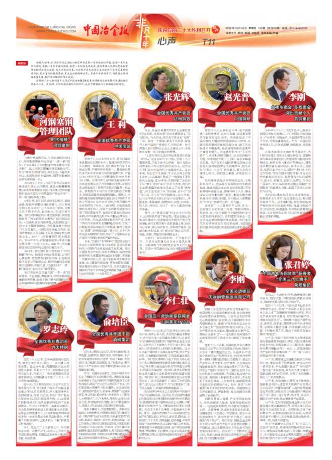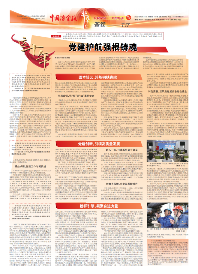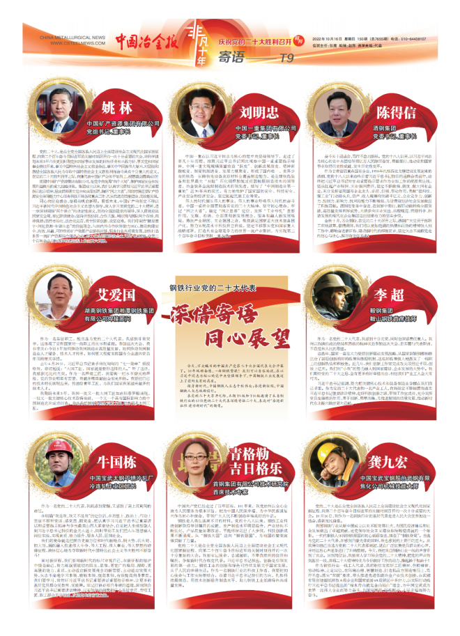 黨的二十大召開(kāi),是重要的時(shí)間節(jié)點(diǎn),也是關(guān)鍵的奮斗坐標(biāo)。應(yīng)廣大鋼鐵企業(yè)和讀者的要求,作為行業(yè)宣傳的主陣地,《中國(guó)冶金報(bào)》隆重推出《非凡十年》慶祝黨的二十大特刊及融媒體報(bào)道,充分展現(xiàn)黨的十八大以來(lái)中國(guó)鋼鐵工業(yè)在以習(xí)近平同志為核心的黨中央的堅(jiān)強(qiáng)領(lǐng)導(dǎo)下所取得的新成就和做出的新貢獻(xiàn)。